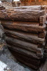 Odkryte natomiast obecnie dobrze zachowane pozostałości drewnianej konstrukcji usytuowane są również w osi północ-południe.